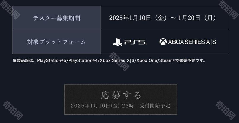 由 FromSoftware 开发、万代南梦宫娱乐发行的协力生存动作游戏《艾尔登法环 黑夜君临》(PS5 / PS4 / Xbox Series X|S / Xbox One / Steam)预计将于 2025 年 2 月举行 PS5 / Xbox Series X|S 版的首次测试,2025年1月10日起开放报名。