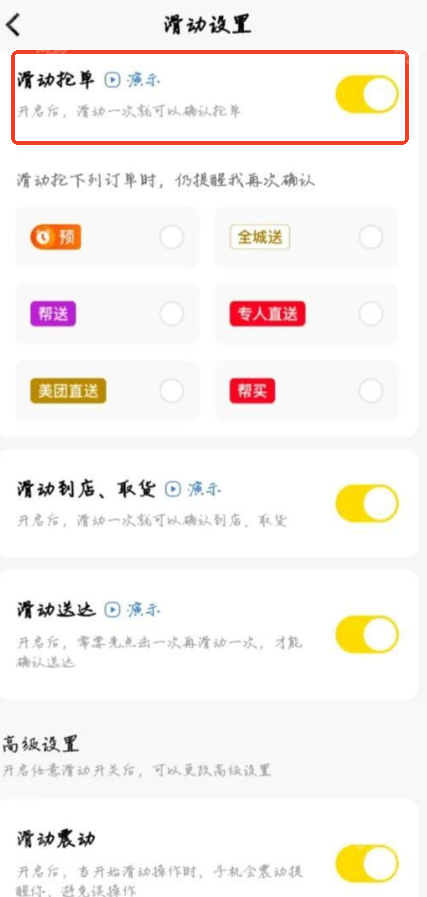 3、在滑动设置中将滑动抢单等功能开启即可