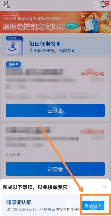 1、首先打开达达秒送骑士app,点击健康证认证,然后点击去认证