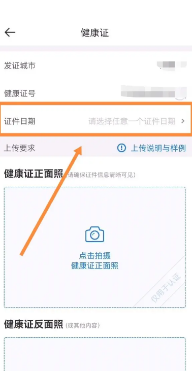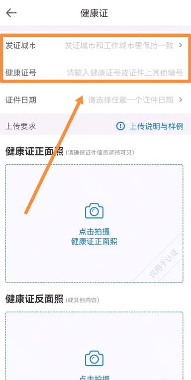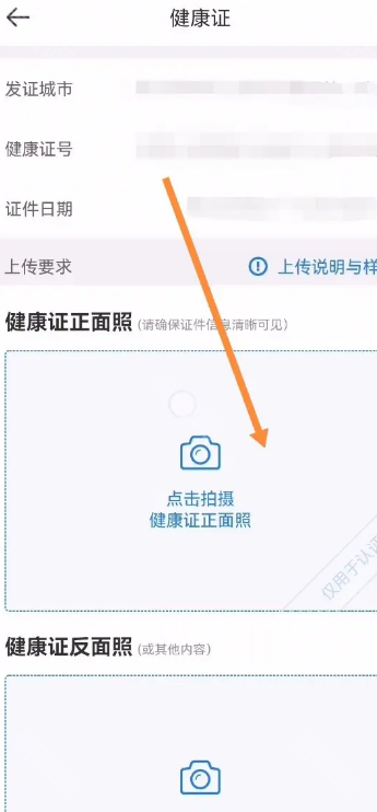 3、填写完成后点击下方上传健康证的正反面