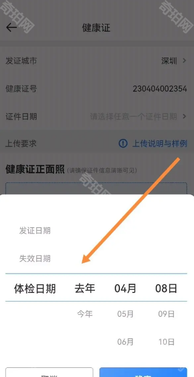 2、在健康证页面中填写相关信息,如:发证城市、健康证号、证件日期和体检日期等