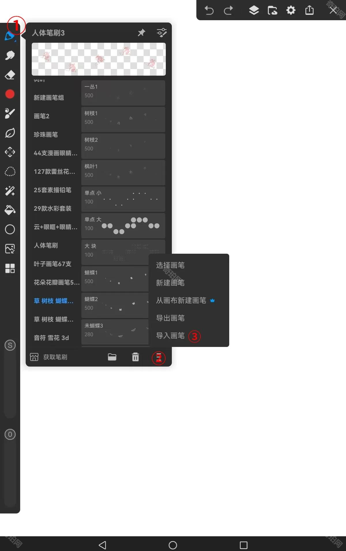 答:画笔图标-三条横杠-导入画笔-选择要导入的笔刷文件