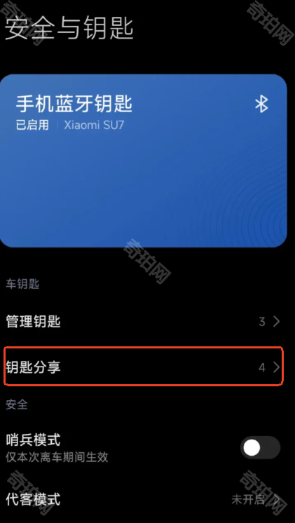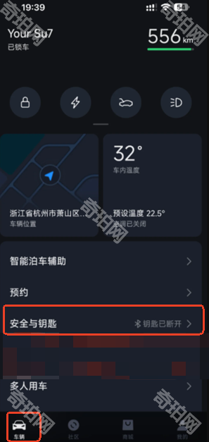 2、打开小米汽车app,在车辆页面进入安全与钥匙功能