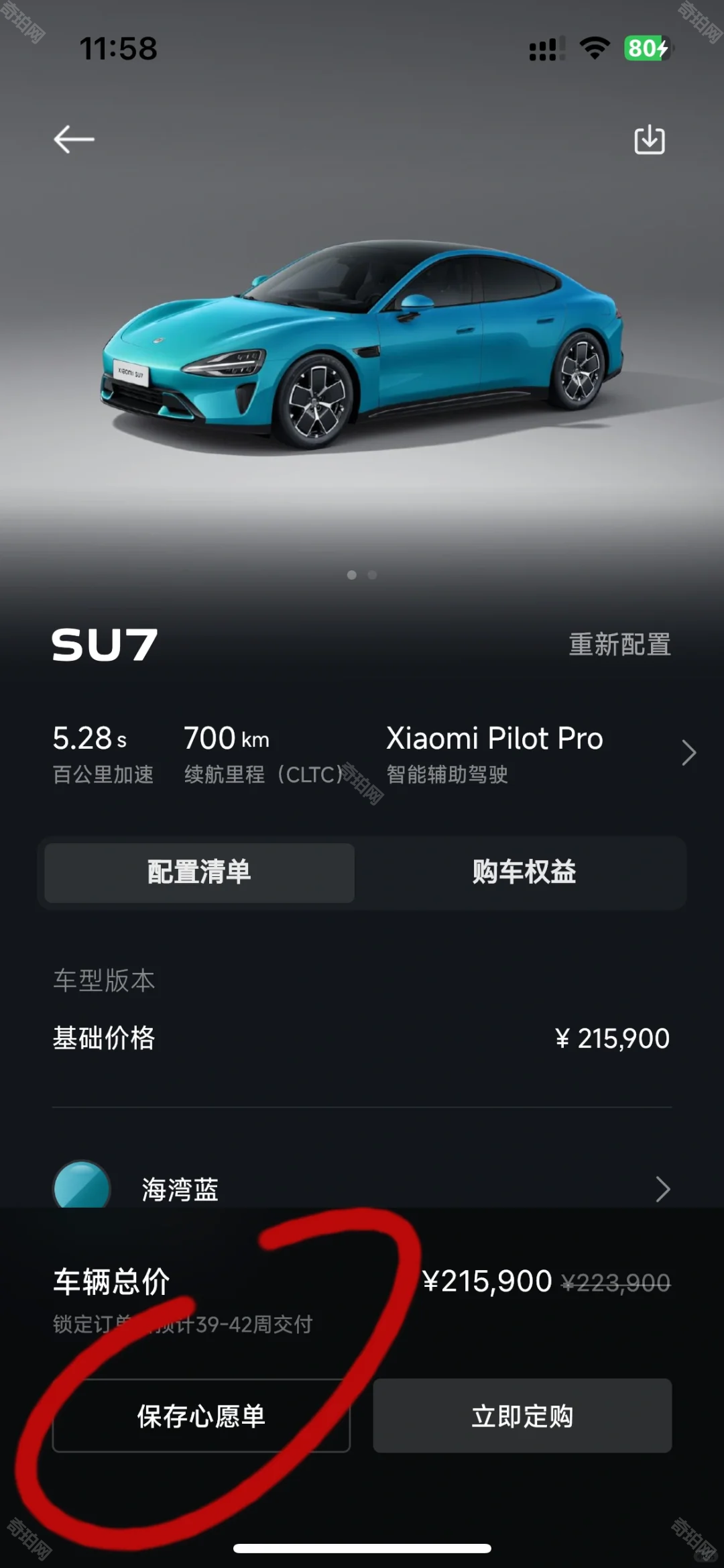 1、我们在完成汽车配置并保存到心愿单后就可以支付定金了