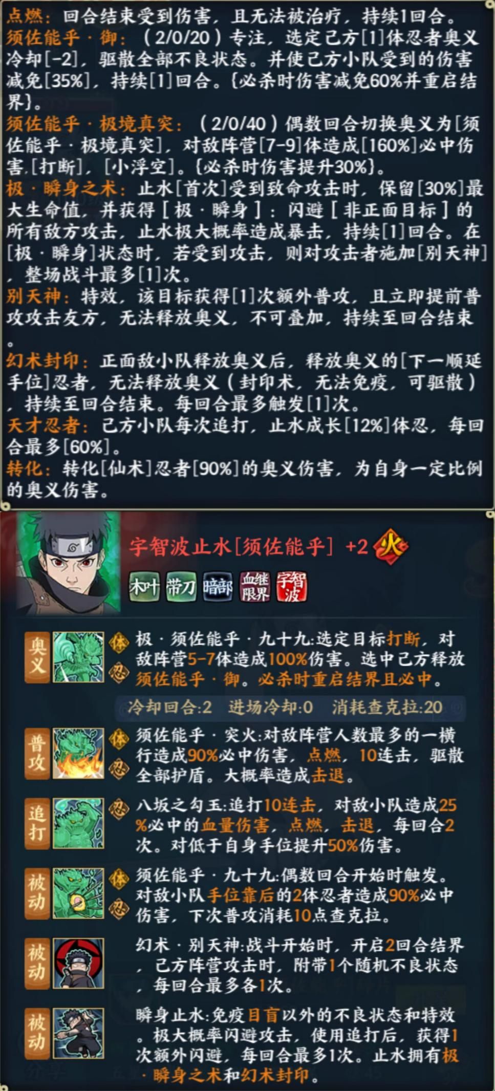 Tip:每回合2次闪避,大幅提升了止水自身的生存能力,也有概率能断掉对方的追打链,其核心在于极·瞬身之术的保命能力,以及造成别天神的效果,还有幻术封印,能打乱对方释放技能的节奏。