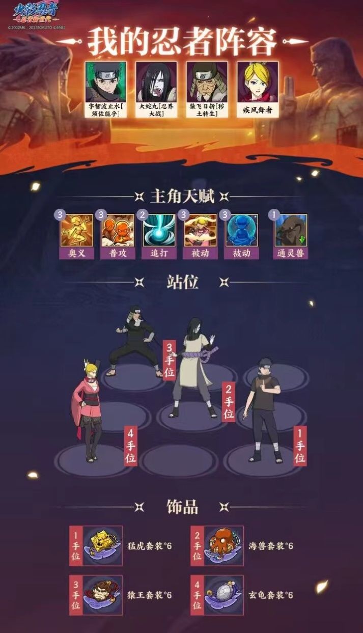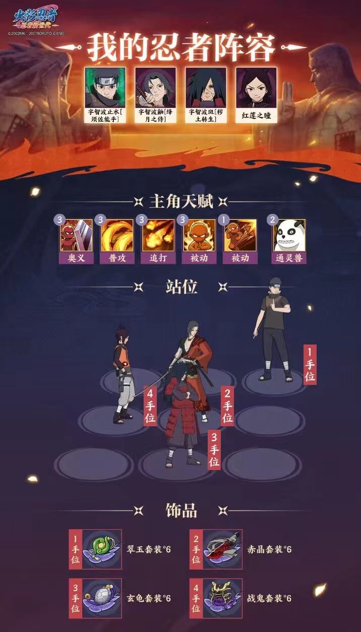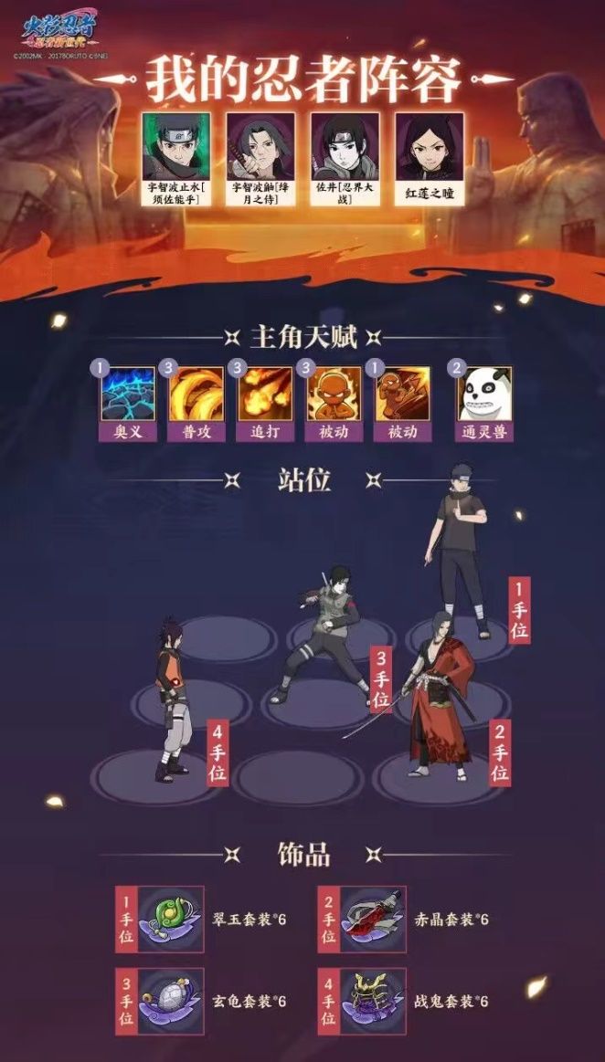 以上阵容推荐的天赋和站位,以及饰品搭配仅供参考,可根据自己的理解与实际情况进行调整。宇智波止水[须佐能乎]的整体技能效果是非常强势的,奥义可攻可守,自身的养成输出能力不俗,目前是作为阵容中的核心输出,但自身的辅助能力也不容小觑,能对敌方造成不同的控制,从而影响整场战斗的走向,期待未来能和更多忍者进行搭配,给我们带来更多精彩的战斗!