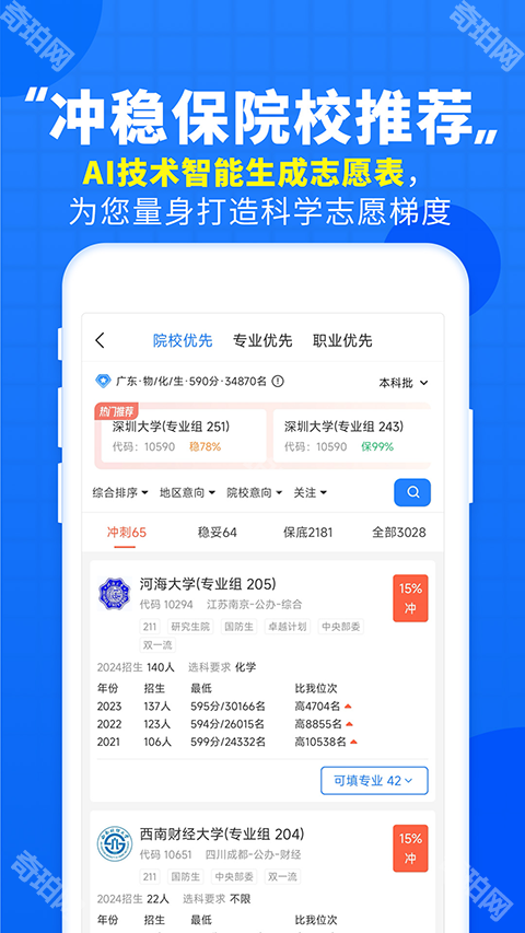 网易高考智愿是由著名的网易公司推出的高考志愿在线查询系统,这款软件不仅提供免费高考查询服务,还提供数据同步和专业的志愿填报服务。同时软件的优秀算法让我们能够更好地找到自己心仪的院校,这款软件也是小编比较推荐大家使用的。