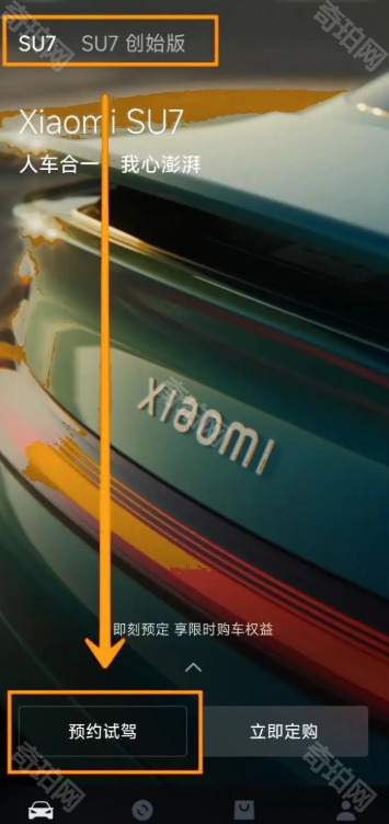 1、首先我们打开小米汽车APP(点击查看下载地址),在购车页面的顶部可以查看不同车型,选择好后点击左下角的预约试驾