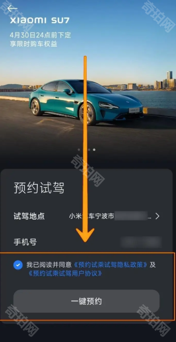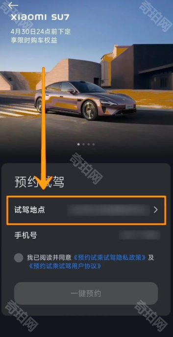2、然后根据提示选择试驾地点并输入手机号,完成后勾选同意协议并点击一键预约
