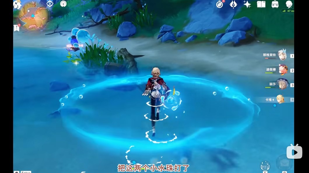 4、顺着宝箱一直走,会发现被两个小水珠守着的水元素晶体,击败小水珠,移动水元素晶体。