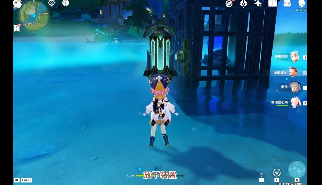 7、然后来到笼子附近,将充能装置放置,解开笼子,放出水元素晶体。