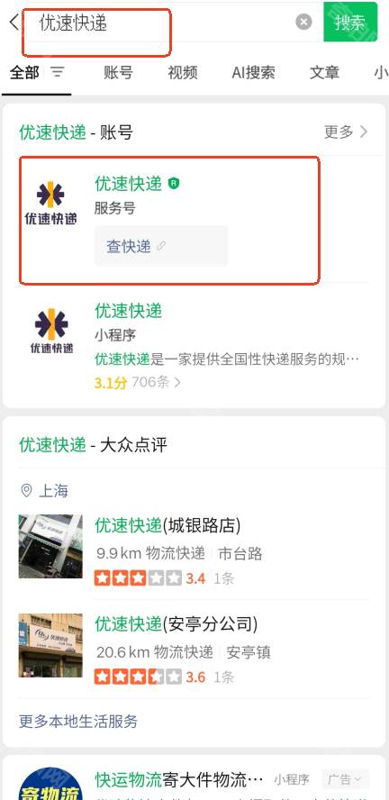 1、首先打开微信,在搜索框中输入优速快递并关注其公众号