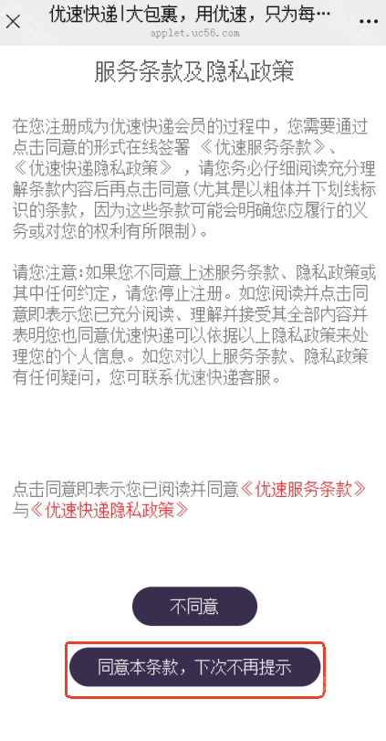 3、然后我们会跳转到小程序,点击底部的同意本条款,下次不再提示