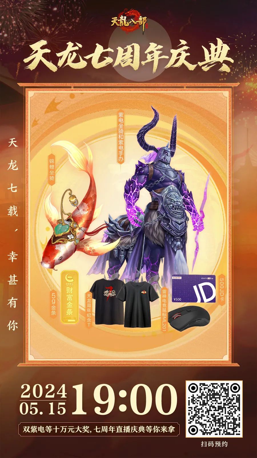 当晚直播期间,我们也为少侠准备了超多豪华福利。抽奖共计七轮,期间将会抽取天龙周年纪念T、雷神电竞鼠标、500元京东卡、锦鲤坐骑(永久)、紫电手办、5g金条、游戏紫电坐骑。超丰厚的好礼与超精彩的直播内容伴你度过美好之夜!