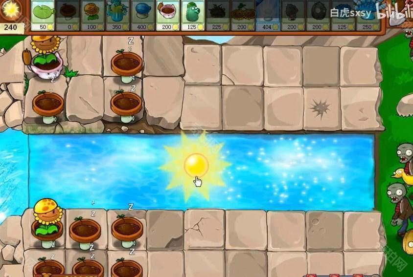 1、在后排小盆菇里面种植阳光向日葵收集能量,前面是水池里面也可以安排上豌豆睡莲。