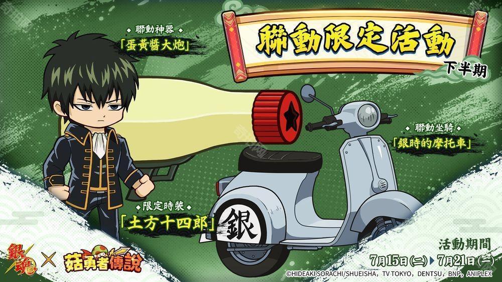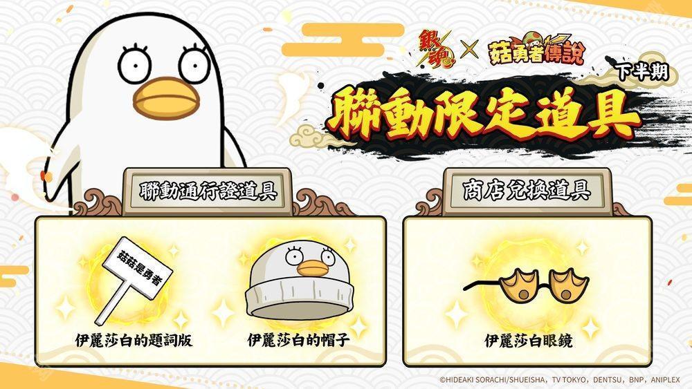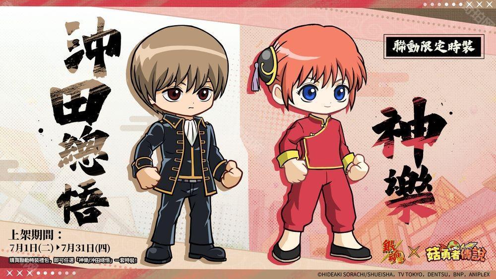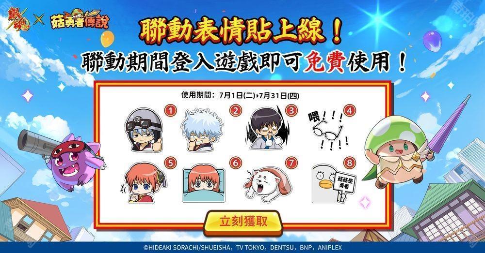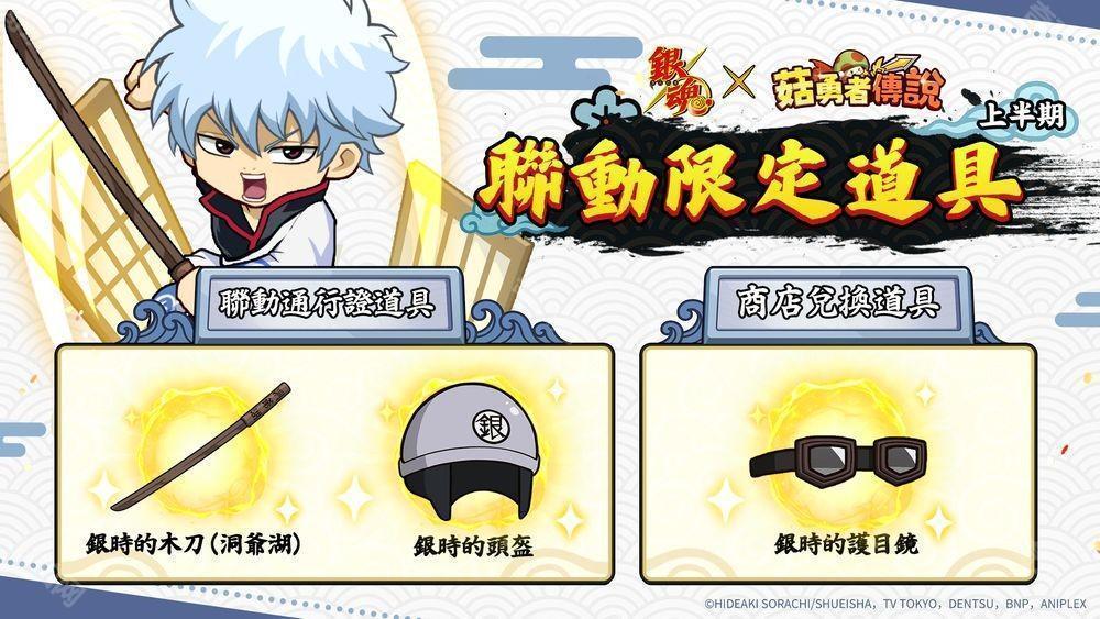 为纪念《菇勇者传说》与 TV 动画《银魂》的首次联动合作,游戏内将限时推出共 8 种合作限定贴图。只要在联动期间登入游戏,即可免费使用所有表情贴!用个性满满的贴图,让与好友之间的交流更加欢乐!一同感受《银魂》的魅力,千万别错过这场特别企划!