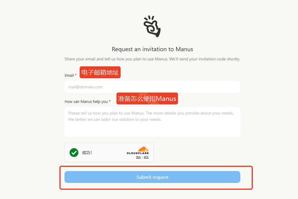 3、在邀请码申请界面中依次填写电子邮箱地址和Manus的使用用途