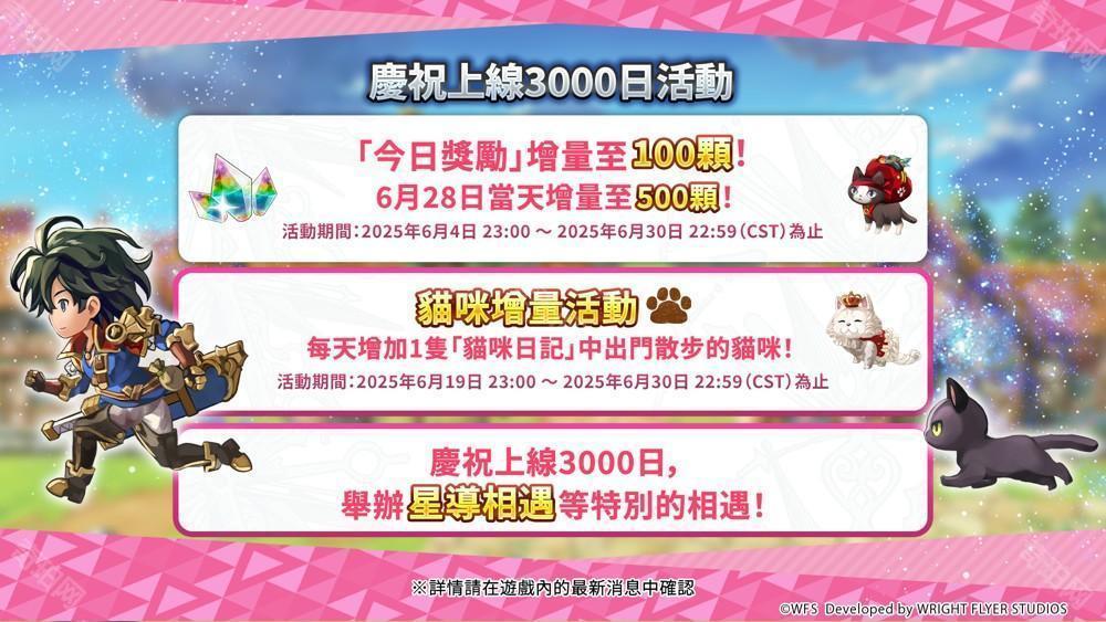 为庆祝《Another Eden:穿越时空的猫》即将于 2025 年 6 月 28 日迎接日本版开服 3000 天,举办增加 1 只「猫咪日记」中出门散步的猫咪的活动,以及可以与 1 位 5★角色以星导觉醒状态相遇的「星导相遇 庆祝 3000 天」。除此之外,还会举办可以和精选的 10 位 5★角色各以 1% 的机率(合计 10%)相遇的「与盟友的相遇 庆祝 3000 天 Part1・Part2」。