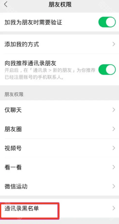 3、在朋友权限页面的底部我们可以进入通讯录黑名单
