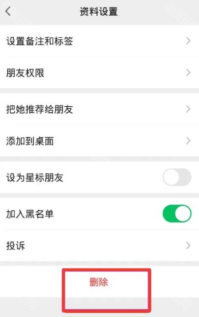 5、在资料设置页面中点击底部的删除,这样就能彻底删掉黑名单中的用户啦