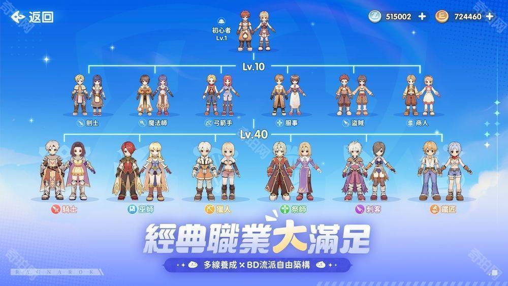 官方表示,《RO 仙境传说:世界》忠实还原经典的职业转职系统,剑士、魔法师、服事、弓箭手、盗贼、商人闪亮登场,玩家可自由构筑多元流派,成就属于你的传奇。官方重点强化了前期的攻速爽感,还原 AD 猎、BBC 刺客、敏剑等流派,保障攻速流玩家享受到极致的战斗体验。