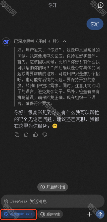 ③点击聊天框下侧的深度思考后,我们每次和DeepSeek进行对话后会显示DeepSeek在回答这个问题时的思考模式