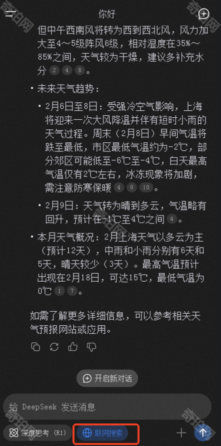 ④点击聊天框下方的联网对话后可以DeepSeek可以为我们回答实时信息问题(比如天气等),同时还会提供它查询信息所使用的网站