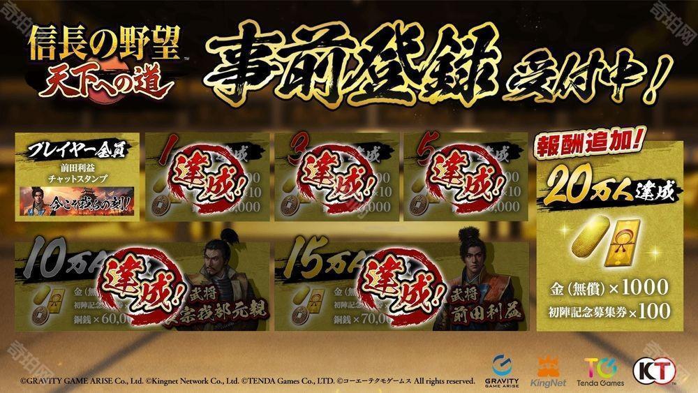 《信长之野望 天下之路》的事前登录活动持续进行中,由于事前登录人数已突破 15 万人,官方宣布追加登录人数达 20 万人的达成奖励:金(无偿)×1,000、首战纪念招募券 ×100。