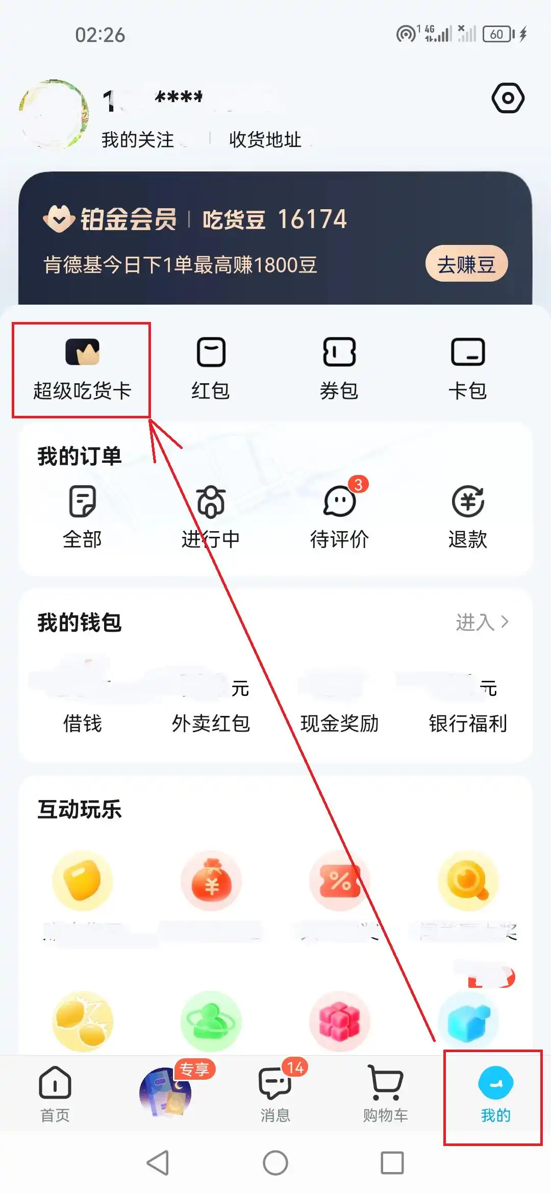 1、首先我们打开饿了吗APP,切换到我的页面,点击左上方的超级吃货卡