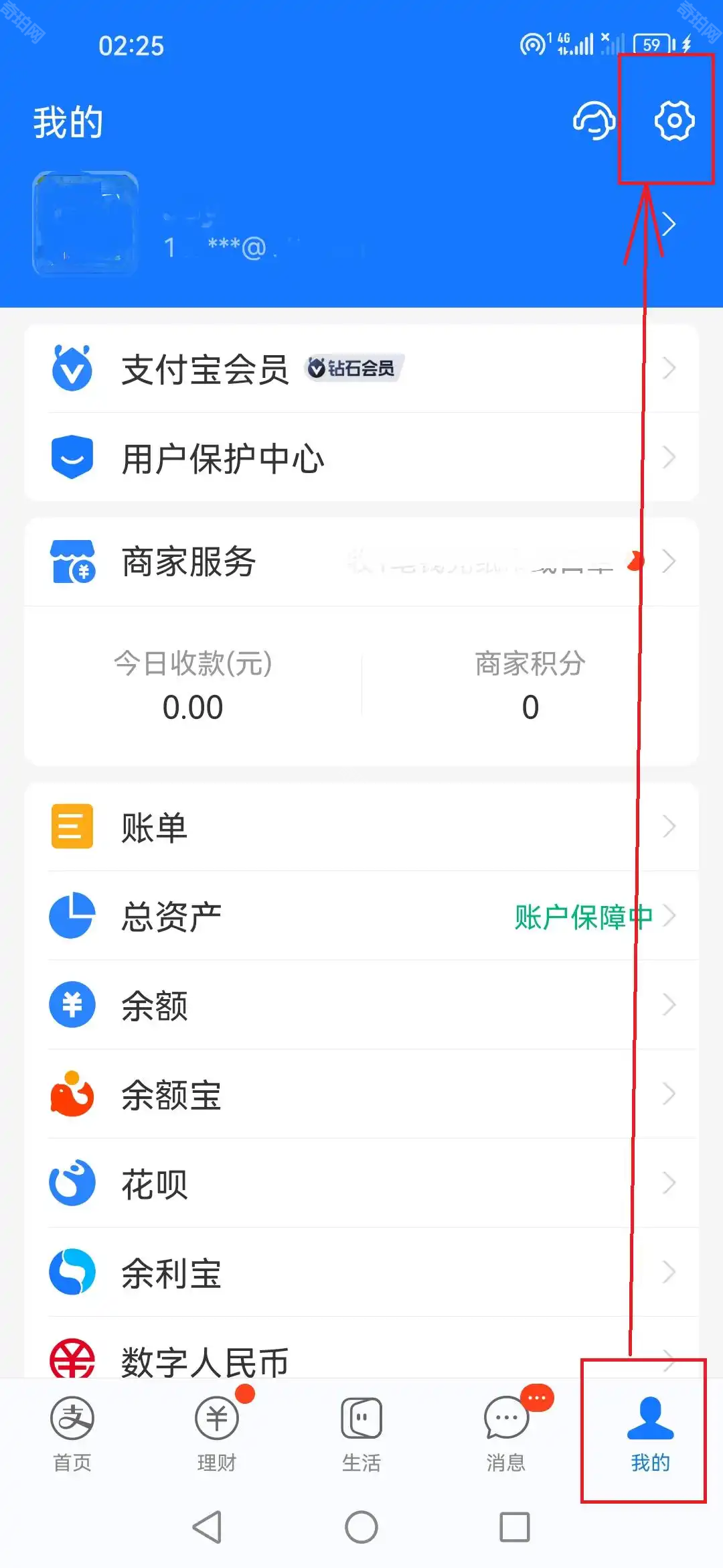 1、首先我们打开支付宝页面,切换到我的页面然后点击右上方的设置(齿轮图标)