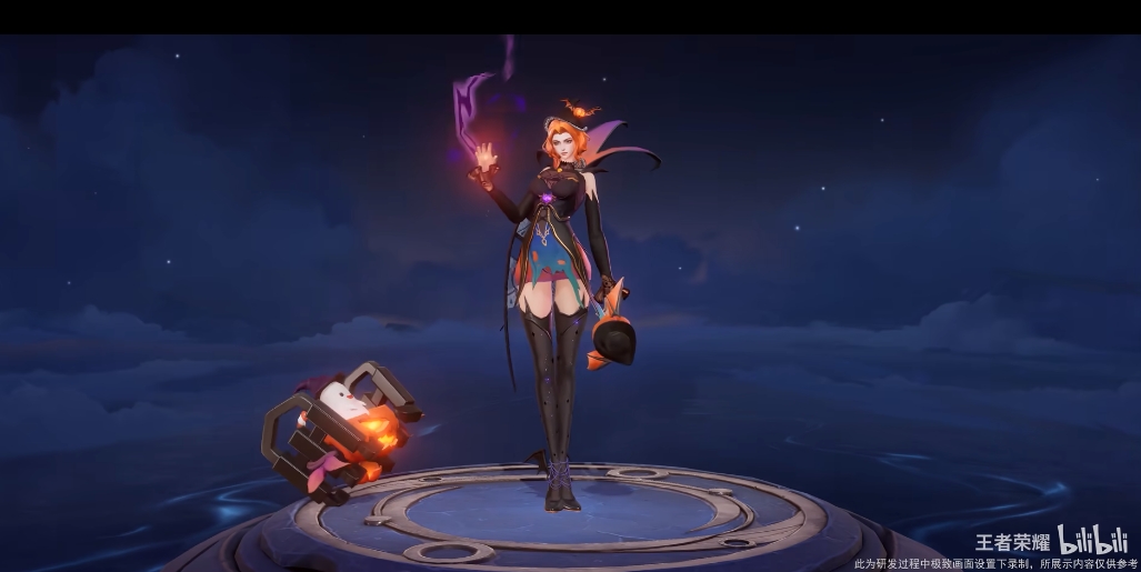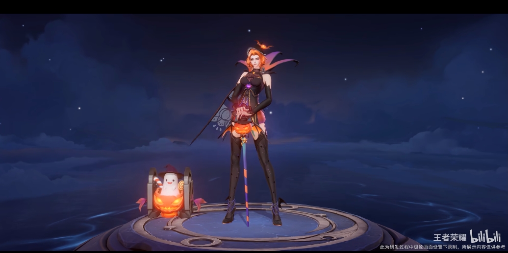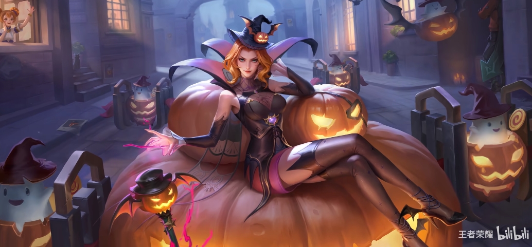 皮肤设计融合经典的哥特风格,通过南瓜手杖、尖顶帽和小蝙蝠等元素的精心搭配,营造出神秘奇幻的氛围。召唤出的小兵也化身可爱的小幽灵,与米莱狄一起参与这场盛大的庆典。