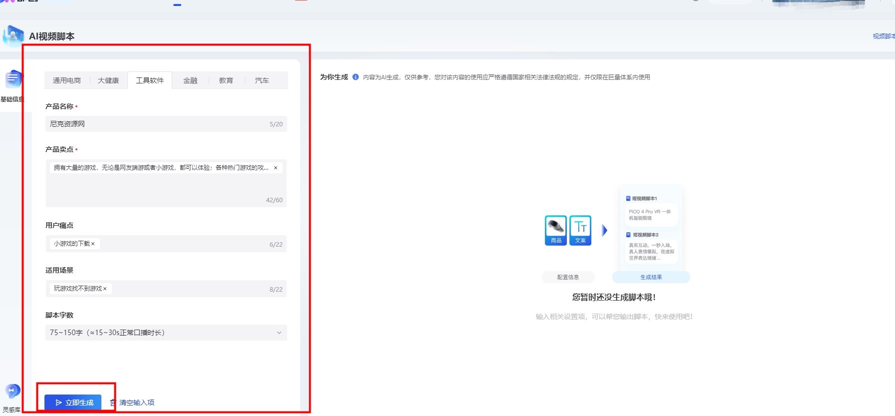 4、输入自己的需求点击【立即生成】即可。