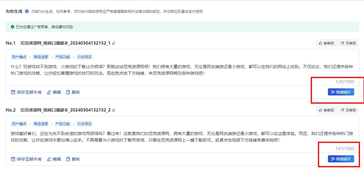 5、这样就可以生成一段视频的脚本了,然后点击自己喜欢的一段口播脚本,点击【快速成片】。