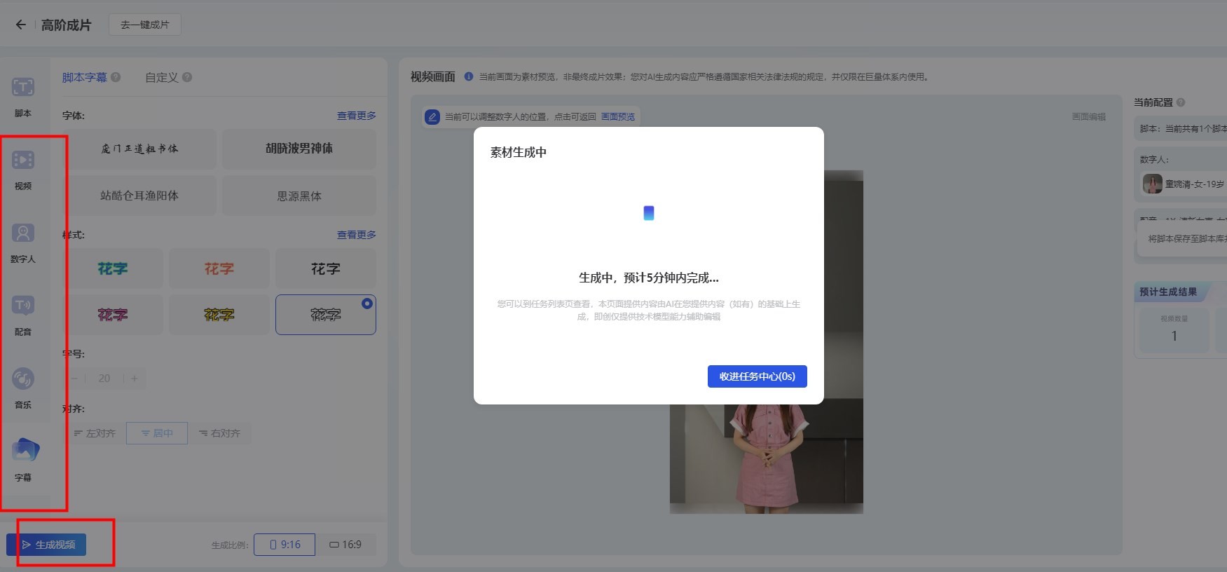 6、然后选择视频、数字人、配音、音乐、字幕即可,还可以上传自己的视频加入哦,全部填写完成后点击【生成视频】即可。