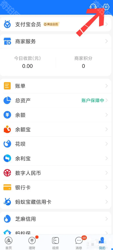 1、首先打开支付宝app,切换到我的页面,点击右上方的齿轮图标(设置)
