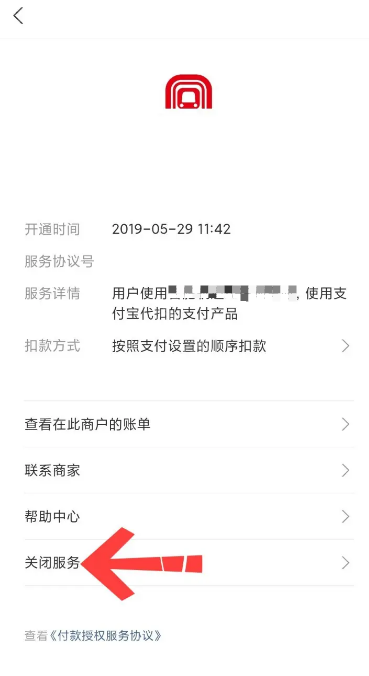 5、在服务详情页面点击关闭服务即可关闭指定的自动扣款服务(每个服务都要手动关闭)