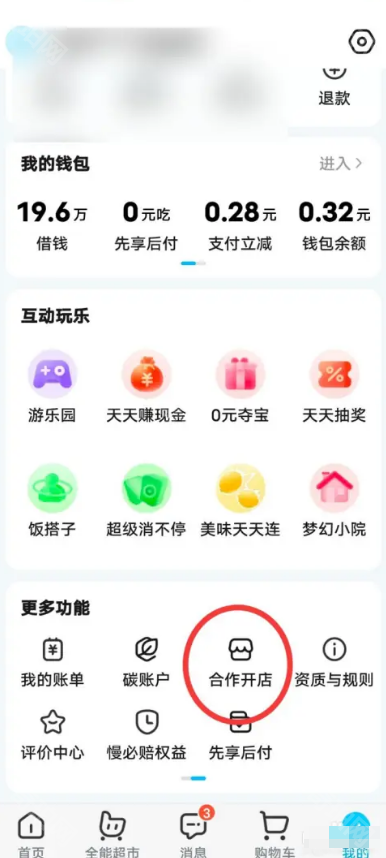 1、首先打开饿了么,切换到我的页面,点击合作开店功能