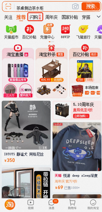 1、首先我们打开淘宝APP,在顶部我们可以看到闪购外卖这个页签,点击切换页面
