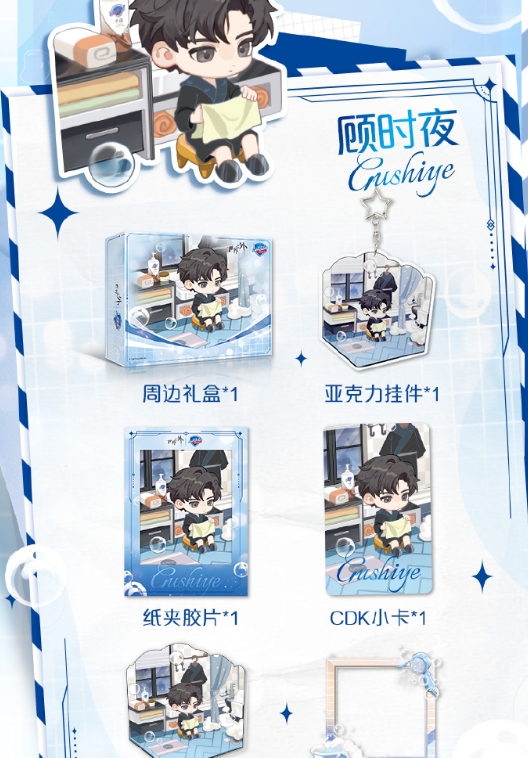 男主单人周边礼盒:相应男主亚克力挂件、纸夹胶片、CDK小卡、防水贴纸等联动周边套组。