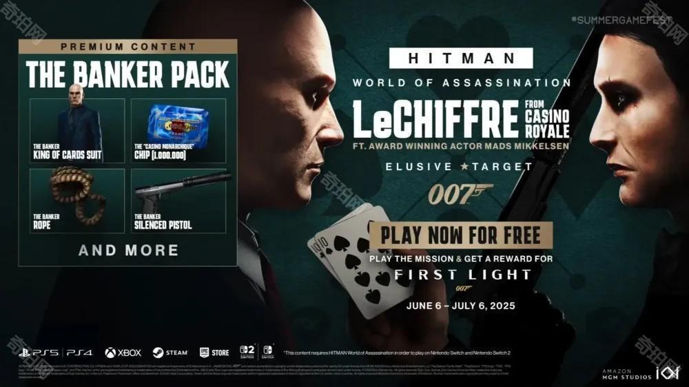 《杀手47:World of Assasinate》将迎来全新限时目标,来自 2006 年电影《007 首部曲:皇家夜总会》的反派角色 ── 银行家兼恐怖分子融资人勒・契夫轲(Le Chiffre),由丹麦演员迈兹・米克森(Mads Mikkelsen)亲自回归配音与诠释。