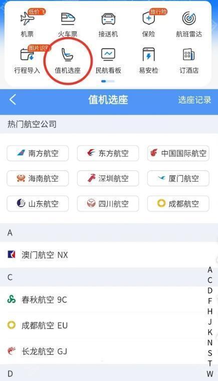 1、打开飞常准APP,在首页找到值机选座功能,选择航空公司