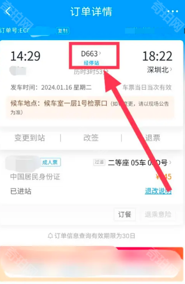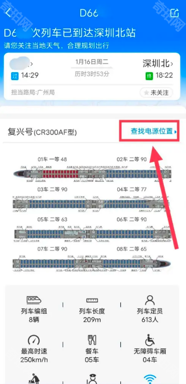 5、这时会显示当前车次的火车相关信息,在右侧有一个查找电源位置,点击进入