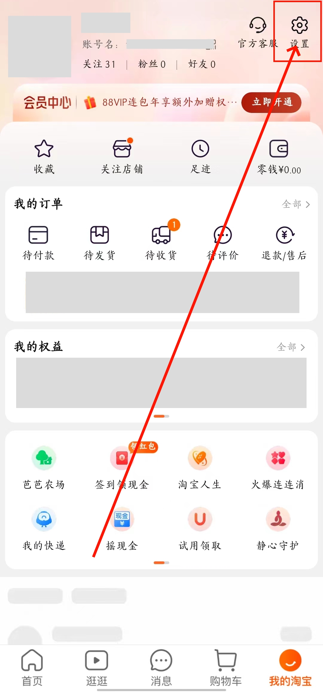 1、首先打开淘宝,在“我的淘宝”页面点击右上角的“设置”。
