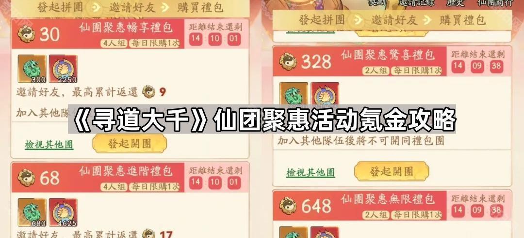 寻道大千仙团聚惠怎么氪金划算?仙团聚惠是游戏寻道大千中的团购类型活动,我们和其他玩家进行组队后便可以进行拼团购买,同时会返还一定机缘。那么这个活动是否值得我们参与呢?参与的话怎么氪金比较省钱?接下来就由小编给大家带来《寻道大千》仙团聚惠活动氪金攻略吧。