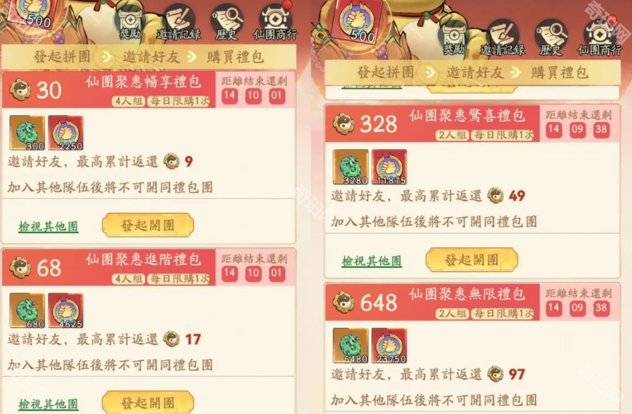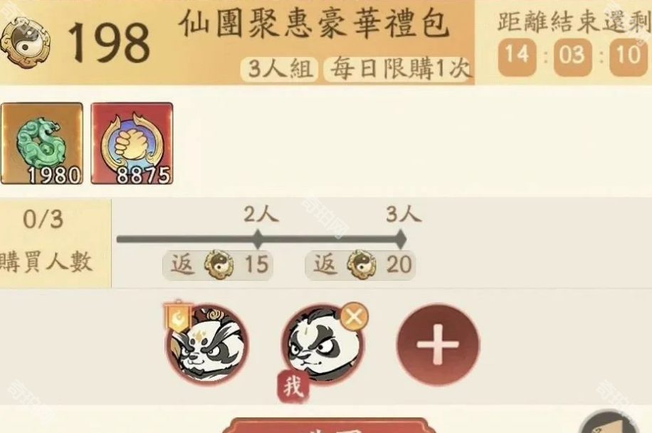 1、仙团活动:玩家可以发起拼图或者直接加入别人的拼图队伍。类似团购类型的,然后进行购买礼包,最多可以3个人组队,拼团购买会返还一定机缘,类似9折差不多。