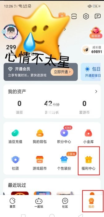 2、然后点击我的,在个人页面,点击福利中心。