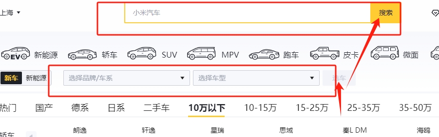 2、没有就通过搜索寻找,或者只有偏好的就点击车型“选车”。