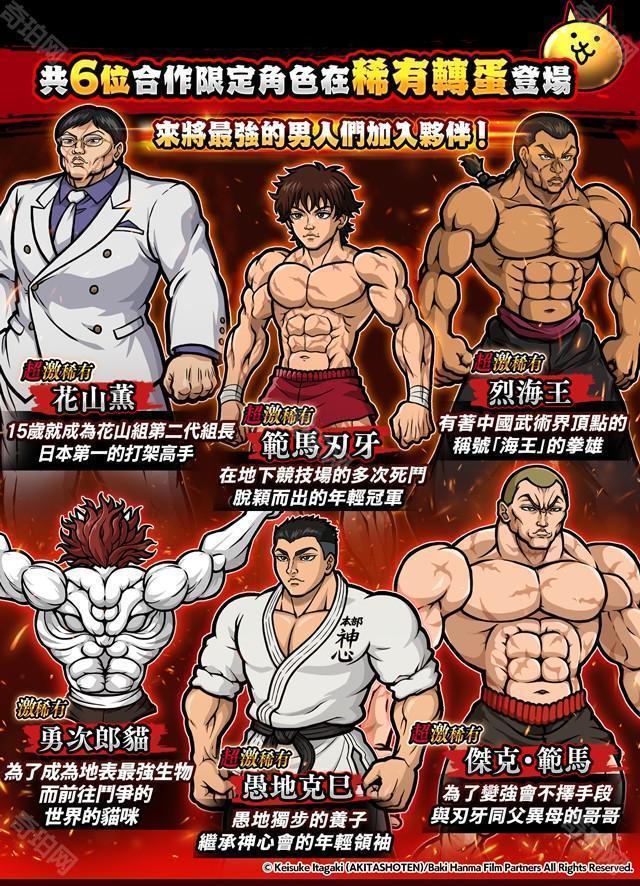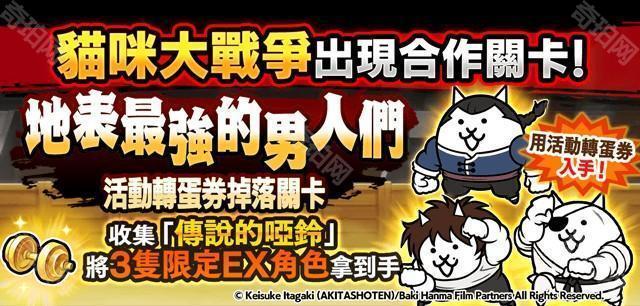官方指出,会出现《范马刃牙》角色们的合作限定关卡进行中,通过关卡就有机会获得活动转蛋券「传说的哑铃」。收集「传说的哑铃」来获得限定 EX 角色「刃牙猫」、「海王猫」和「独步猫」及其他道具吧,来《猫咪大战争》体验「范马刃牙」的世界吧。