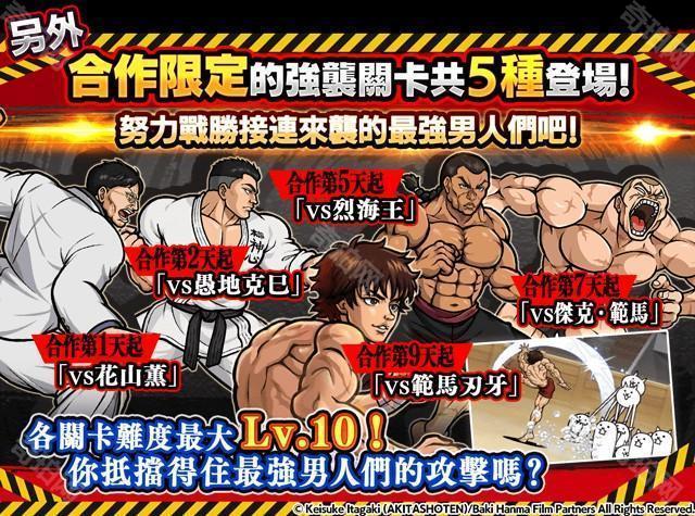 PONOS 株式会社(京都府京都市)所开发的手机 APP 游戏《猫咪大战争》与动画《范马刃牙》举办合作活动,活动于 2025 年 5 月 26 日(一)11:00 开始。