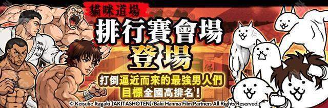 猫咪道场中「排行赛会场」将举办合作期间限定活动「史上最强生物决战!」,「范马刃牙」的多位角色都会在此活动中登场,来试试看自己的实力吧。